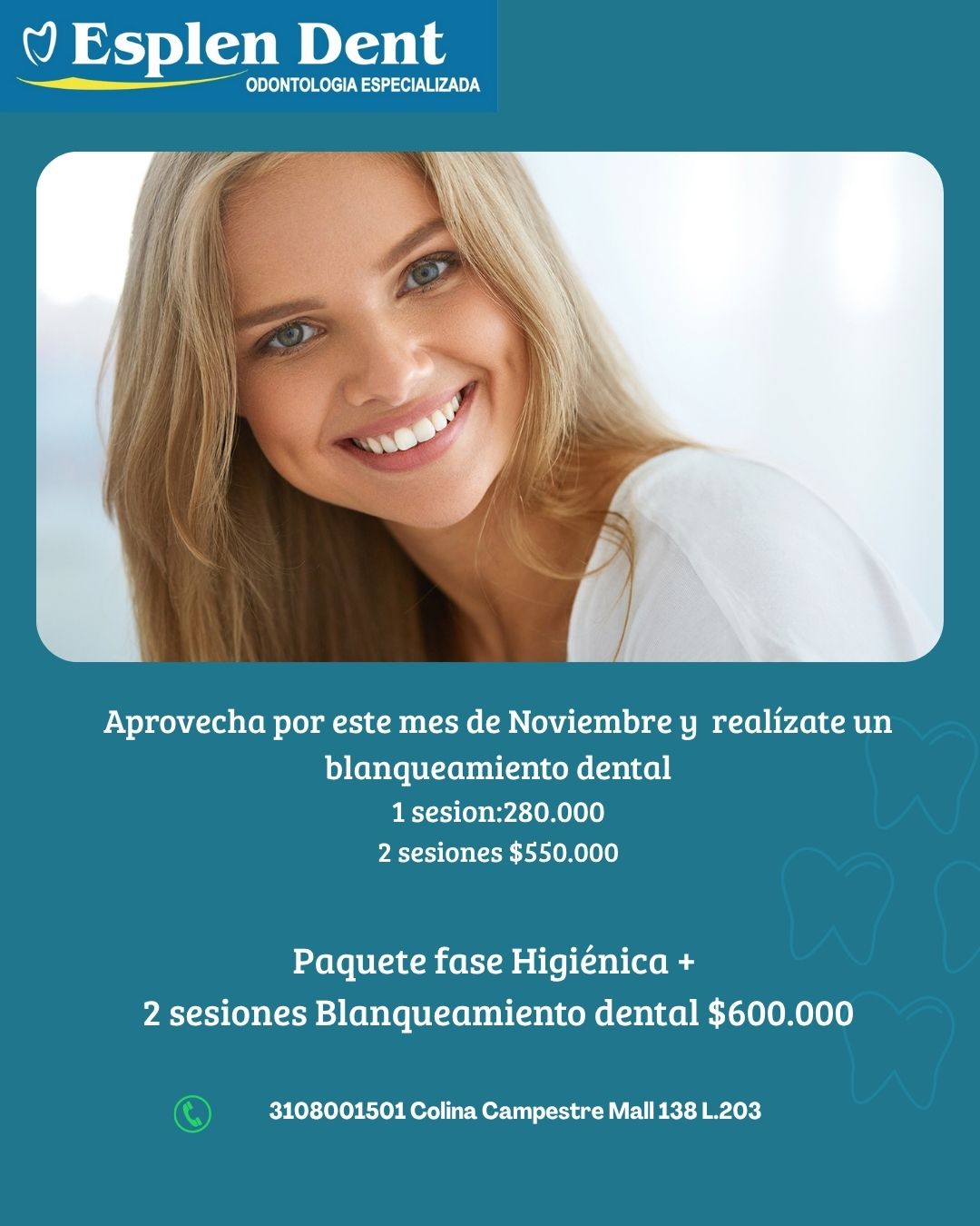 En este mes de Noviembre aprovecha nuestra promoción en Blanqueamiento dental. 2 sesiones por $550.000 o 2 sesiones de Blanqueamiento + Fase Higiénica con cavitron en $600.000.